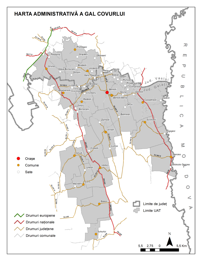 Din componența teritorială a Asociației GAL Covurlui fac parte 16 UAT-uri. Teritoriul este coerent și omogen din punct de vedere geografic și cuprinde o suprafață totală de 1.015,42 km2, o populație de 31.893 locuitori și are o densitate de 31,41 locuitori/km2. Cuprinde un oraș mic și 12 comune din județul Galați și trei comune din județul Vaslui. Singurul oraș din componența teritoriului este Berești și reprezintă 7,75% din totalul populației teritoriului și 4,55% din totalul suprafeței parteneriatului. Față de perioada de programare 2014-2020, teritoriul GAL s-a majorat cu Comuna Suhurlui, care a aderat în parteneriatul nou constituit, din zona albă. Teritoriul GAL Covurlui, se întinde de la partea de sud a județului Vaslui și se continuă până la partea de nord-est și centrală a județului Galați.